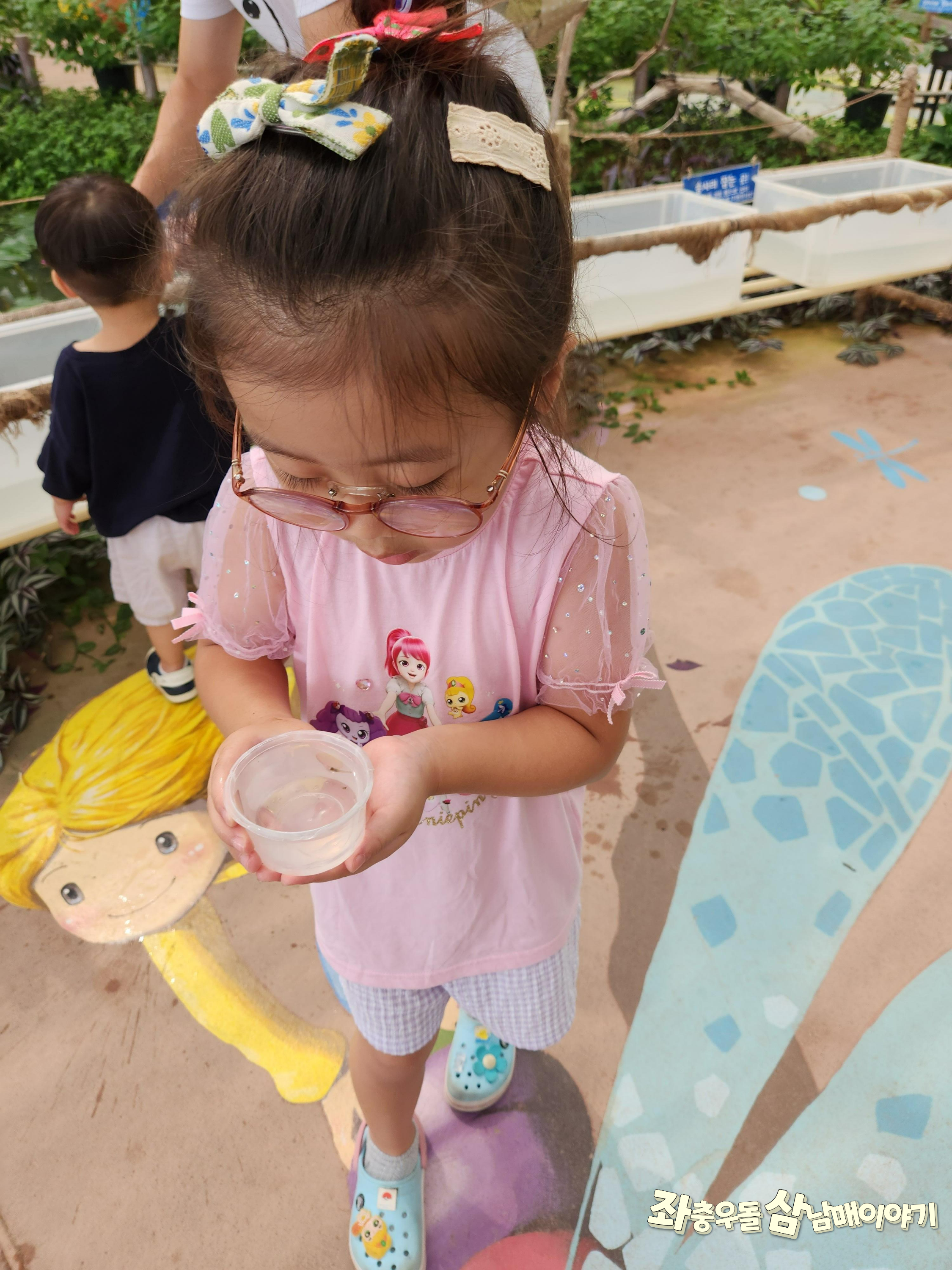 수조에 있는 송사리새끼 1마리씩 체험통으로 잡아서 송사리 풀어주는 곳으로 이동해준답니다.
