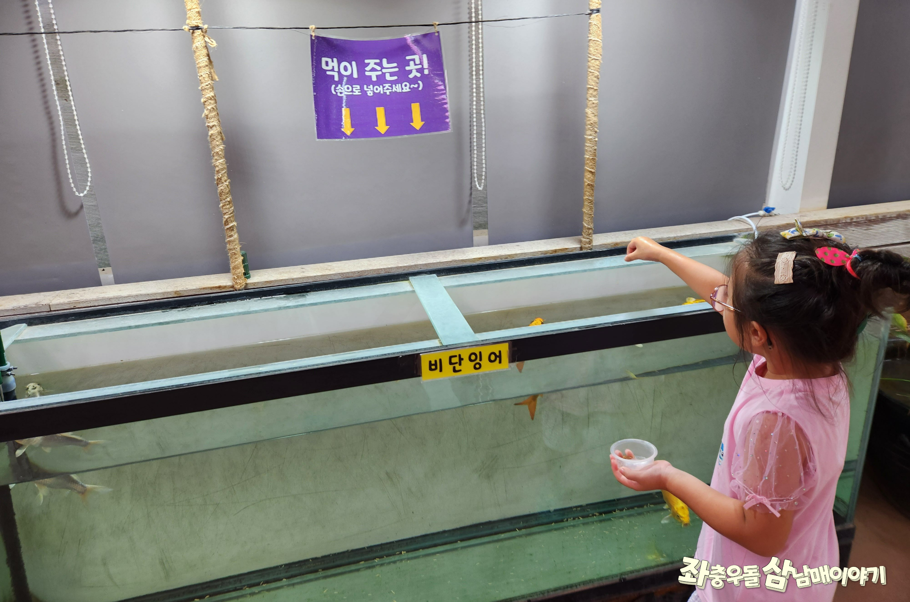 송사리를 풀어주고나면 물고기들에게 먹이를 줄 수 있었어요.