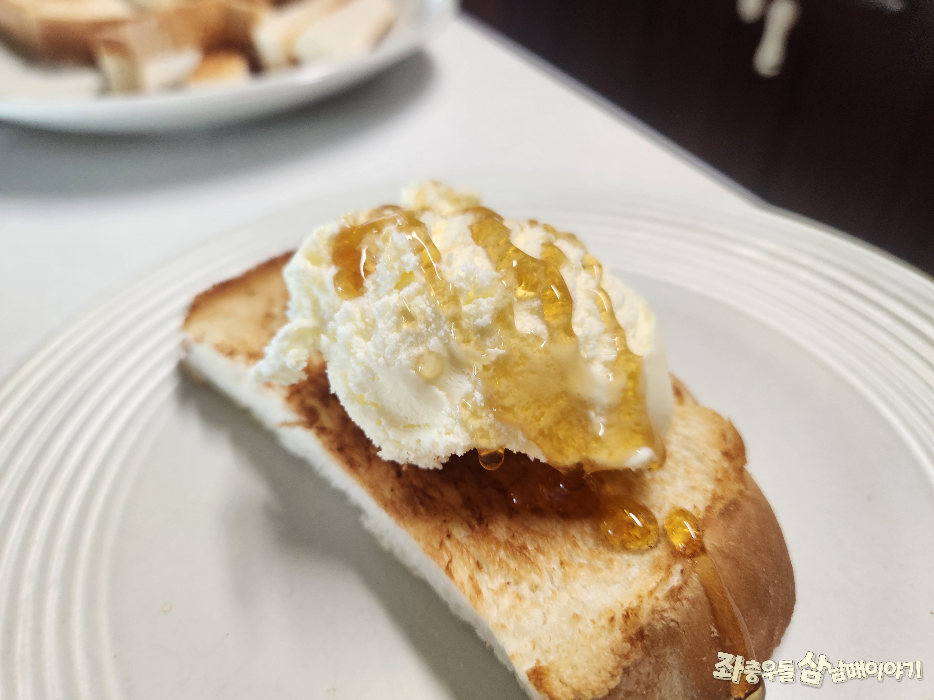 바삭 구운 토스트 위에 바닐라 한스쿱 올려서