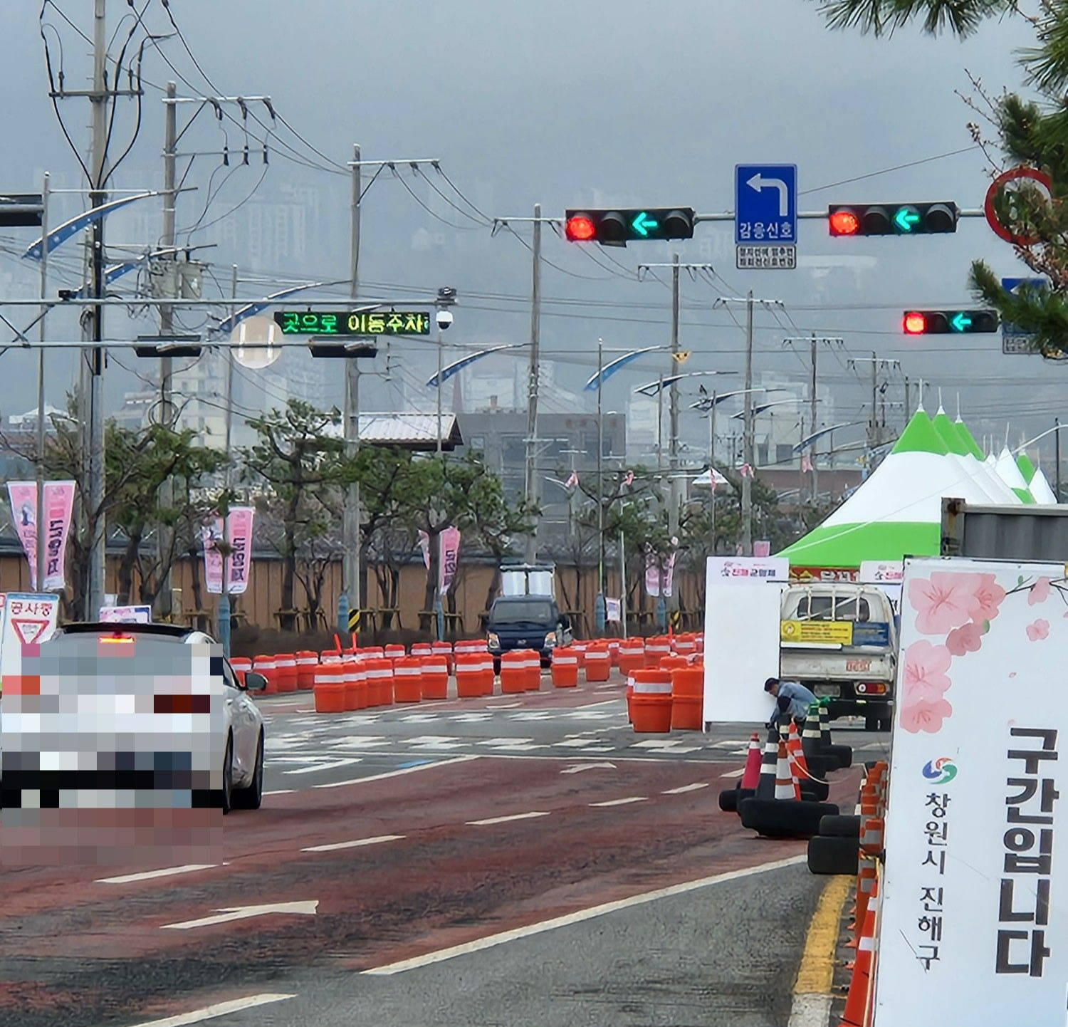 진해루 도로쪽에 먹거리 천막들이 자리잡고있고, 그 뒤쪽 도로를 1차선씩 이용가능하게 변경해놨어요.