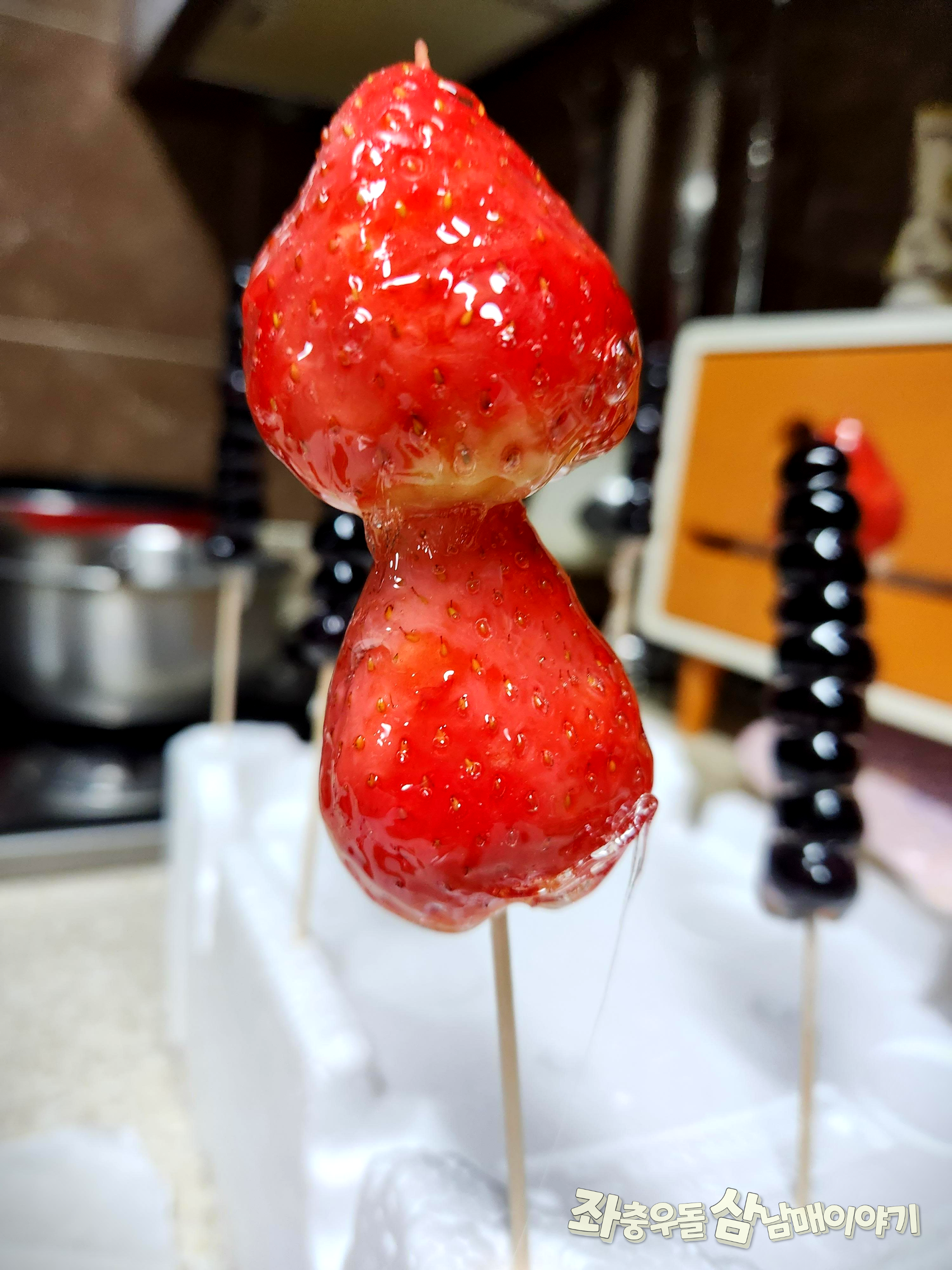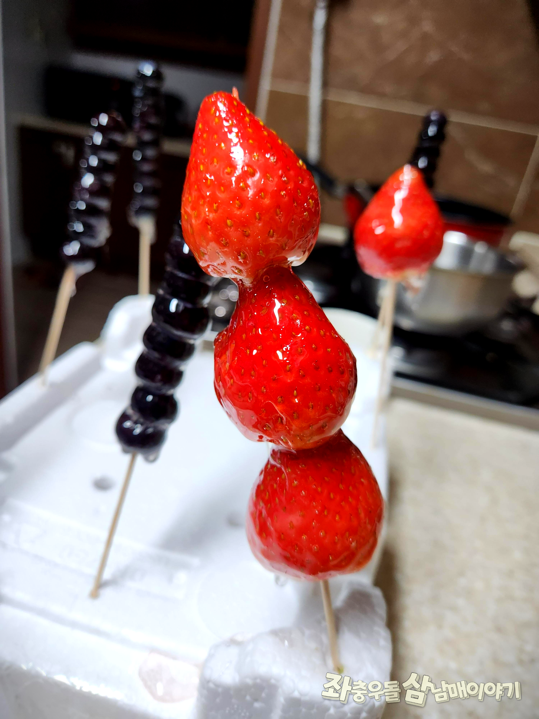 2. 나무꼬치가 생각보다 힘이 없어서 딸기 3개에 시럽을 코팅하니 무거워서 주르륵 흘러빠지네요.